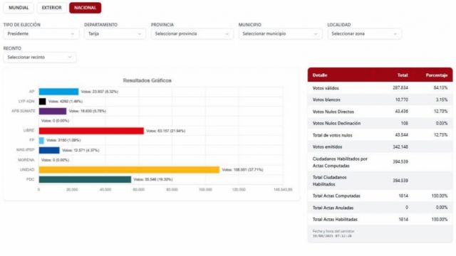 Local Alianza Unidad Gana Tres Circunscripciones en Tarija Superando el 37%... El Tribunal Electoral Departamental de Tarija ha finalizado el cómputo del cien por ciento de las actas correspondientes a las... BY agencianinoticias@gmail.com agosto 20, 2025 0 Comment